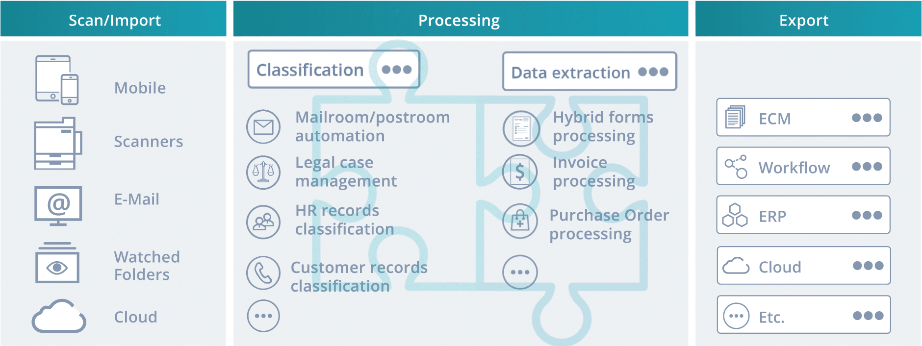 - Multi-Channel all types of documents: paper, electronic, e-mail in different formats